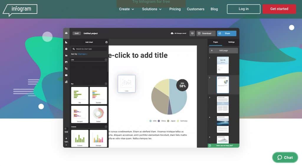 Infogram is really cool! Infogram‘s intuitive drag-and-drop editor allows you to plug in your data and transform it into something aesthetically beautiful and impactful, quickly.